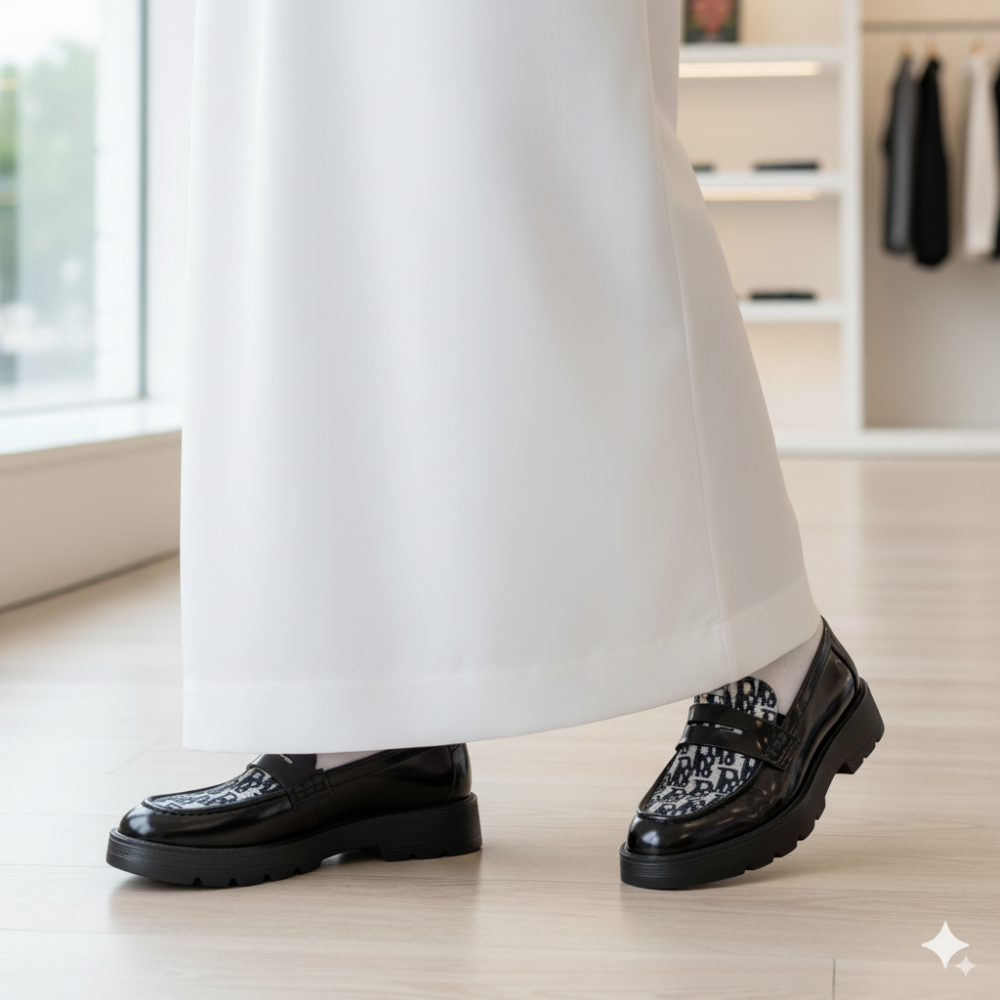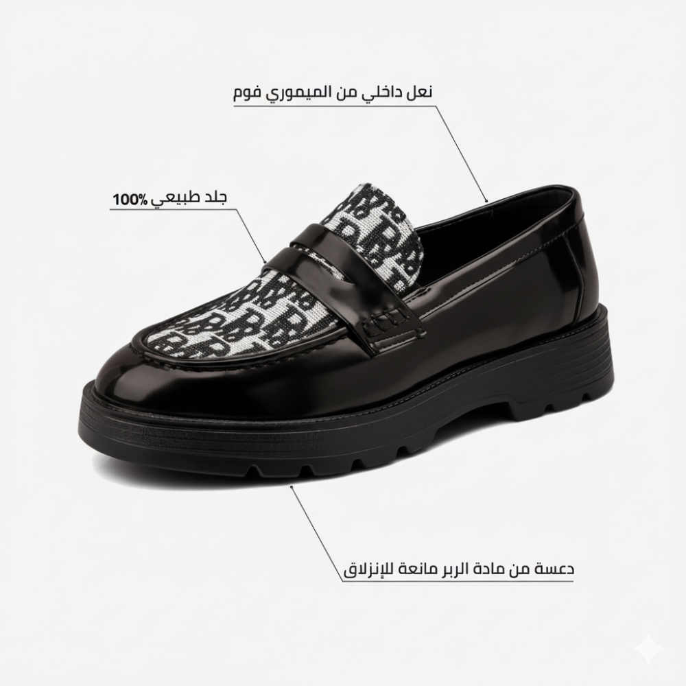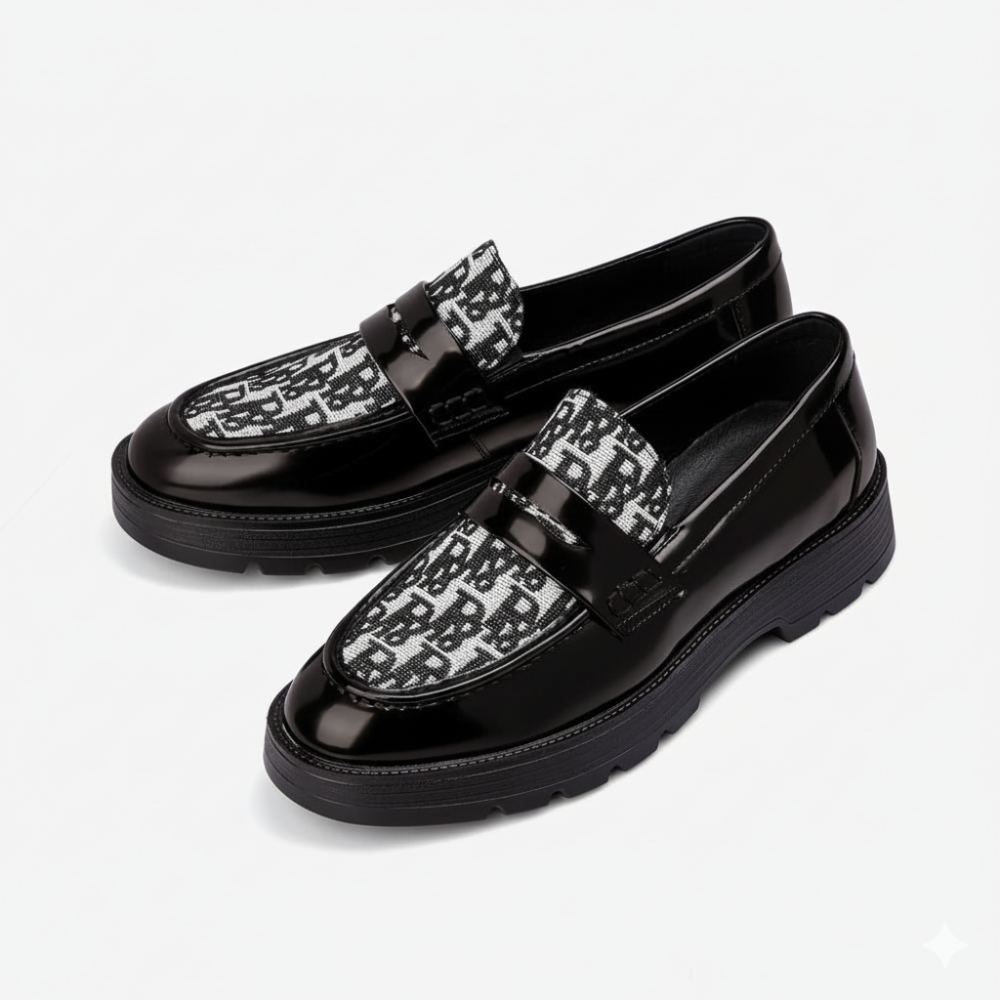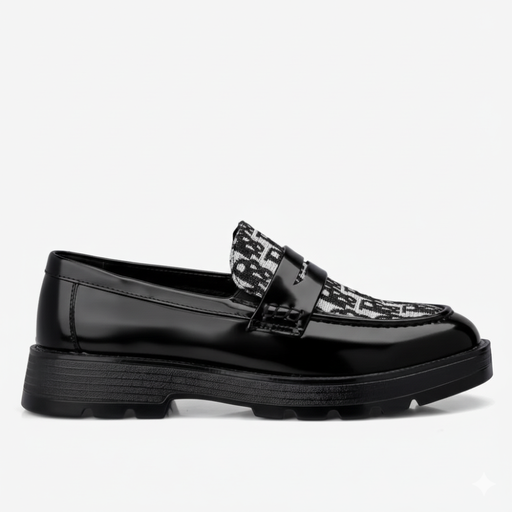حذاء لوفر أسود جلد لامع بقماش منقوش
