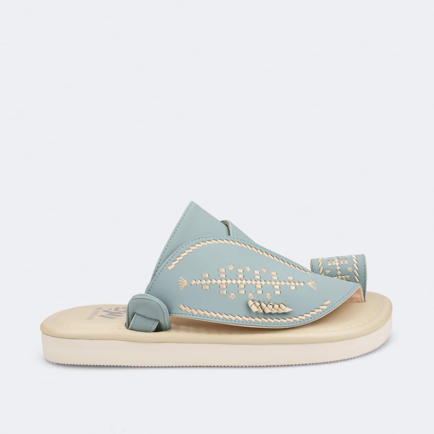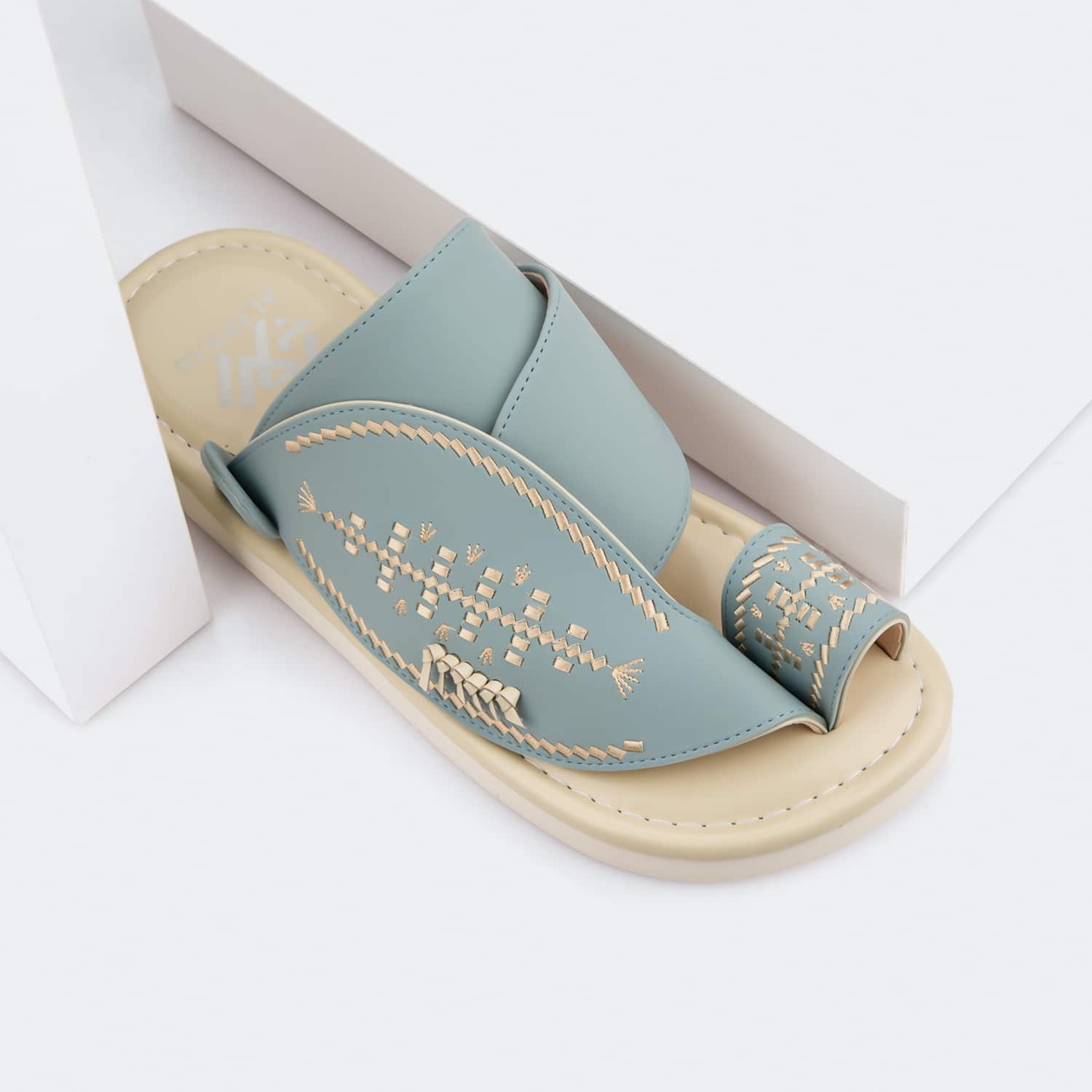 خف وطني شرقي بتصميم فريد يدمج بين الأصالة والحداثة، حيث يزينه تطريز دقيق باللون السماوي الذي يضيف لمسة من الأناقة والنقاء. مصنوع من خامات طبيعية عالية الجودة، مما يجعله الخيار المثالي للراحة طوال اليوم. النعل الخارجي المتين يمنحك ثباتاً ممتازاً ويجعل الحركة أكثر سلاسة، بينما التصميم الشرقي يضفي لمسة من الفخامة على كل خطوة.