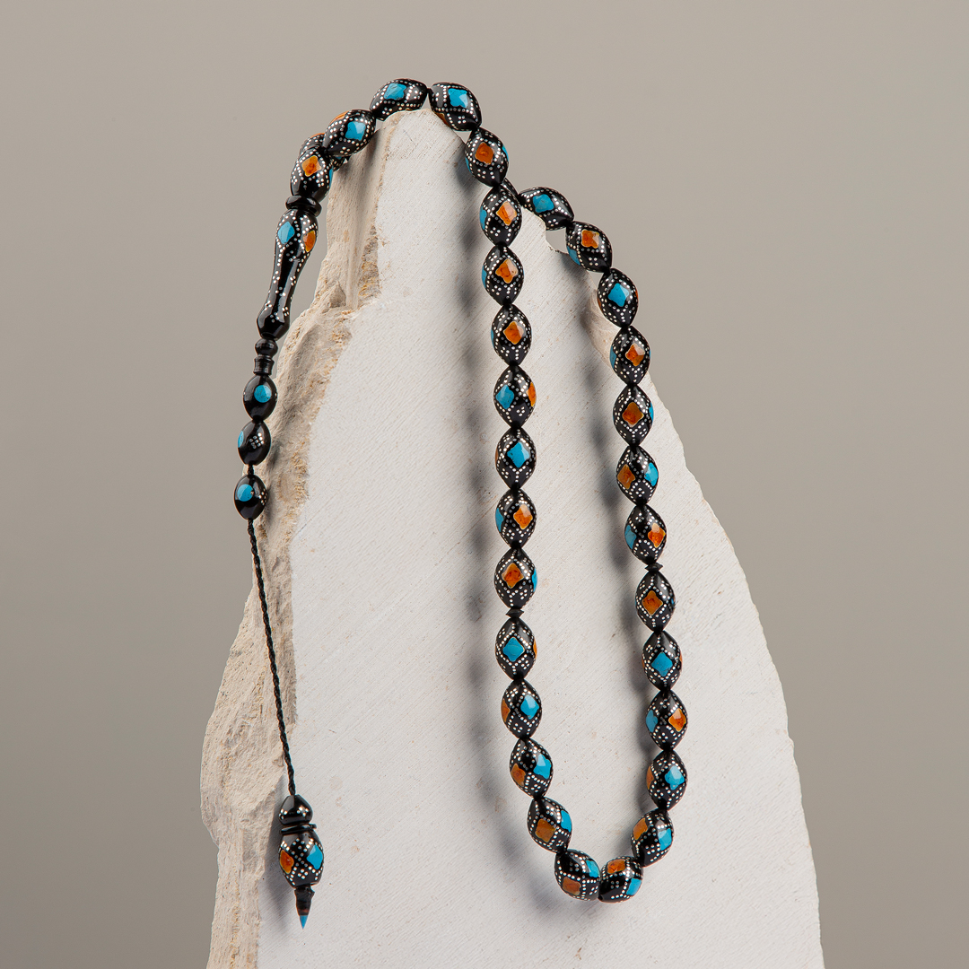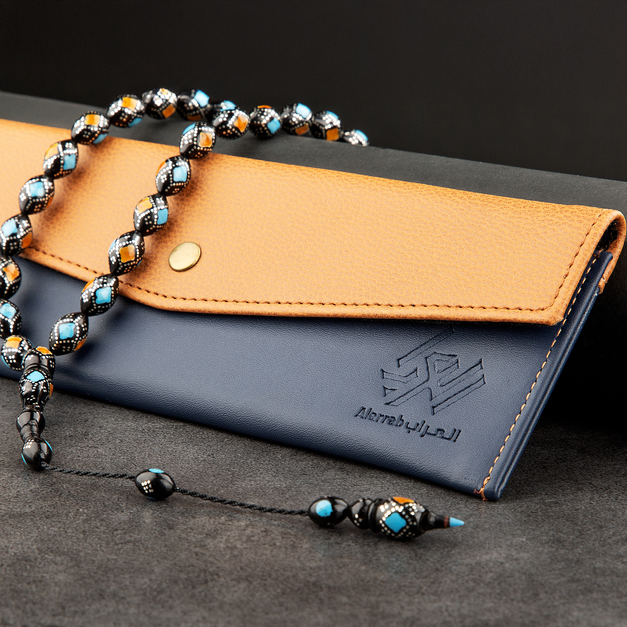 سبحة فاخرة مصنوعة من اللون الأسود الكلاسيكي، مزينة بنقوش رائعة من الأزرق والبرتقالي تضيف لمسة من الحيوية والجاذبية.
