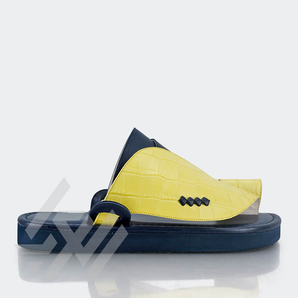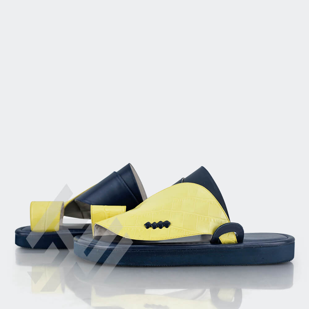 حذاء شرقي كحلي وأصفر بخامات طبيعية إيطالية يتميز بتصميم فريد يمزج بين الألوان الجذابة والخامات الفاخرة. مثالي لكل من يبحث عن الراحة والأناقة في آن واحد.