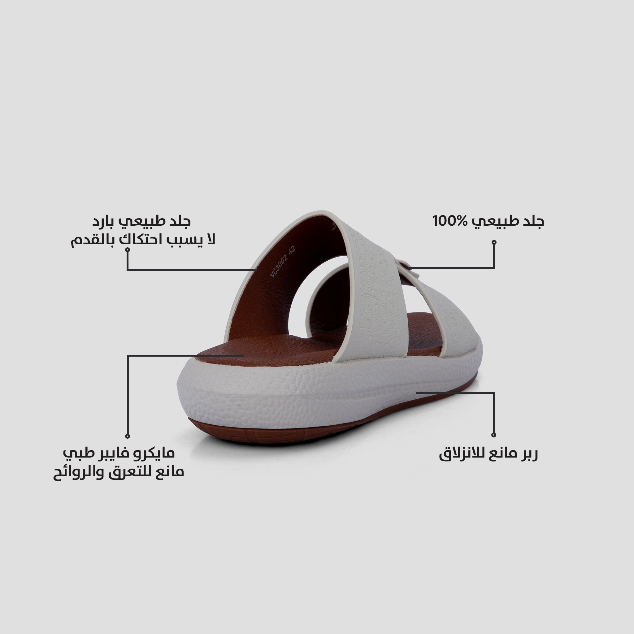 - جلد العلوي الليّن: يتميز هذا النعال بجلد طبيعي ناعم ومقاوم للتعرق، يضمن تهوية ممتازة للقدم في أجواء المملكة الحارة.
