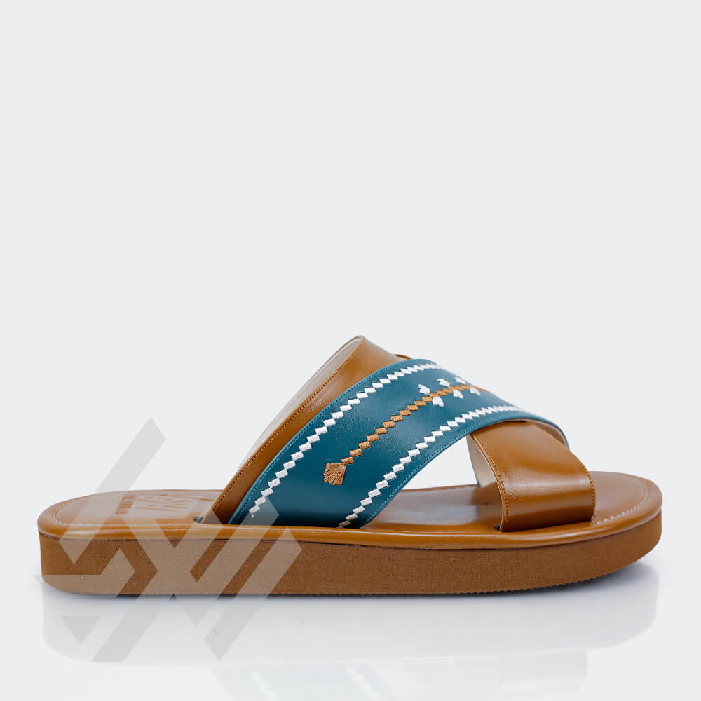 نعال خليجي أنيق مصنوع من الجلد الفاخر بلوني العسلي والفيروزي، مع تطريز راقٍ يعكس الأصالة والفخامة. تصميم مريح يناسب الاستخدام اليومي والمناسبات الخاصة، مع لمسة تراثية تضيف تميزًا لإطلالتك.